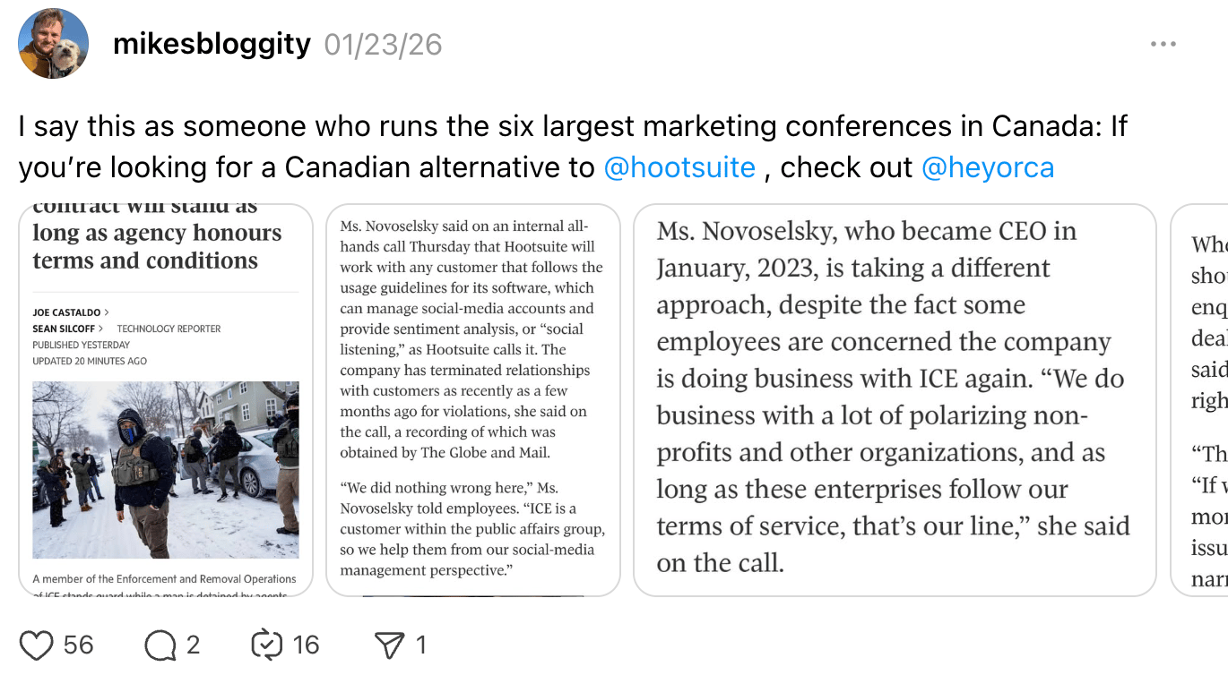 Canadian tech company Hootsuite has been facing backlash for work connected to U.S. Immigration and Customs Enforcement (ICE). The social media management and support contract is worth up to USD $2.8M (BetaKit has more).