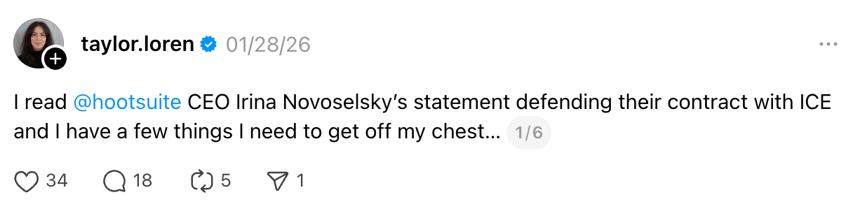 For one, it’s not the first time. Hootsuite backed away from an ICE-related deal less than 6 years ago after internal and external pressure. The “lesson” people took was: employee voice matters, community pressure works, values won. (More on that soon).